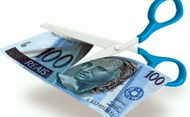 | Descrição para cegos: imagem de uma cédula de cem reais sendo cortada ao meio por tesoura. |